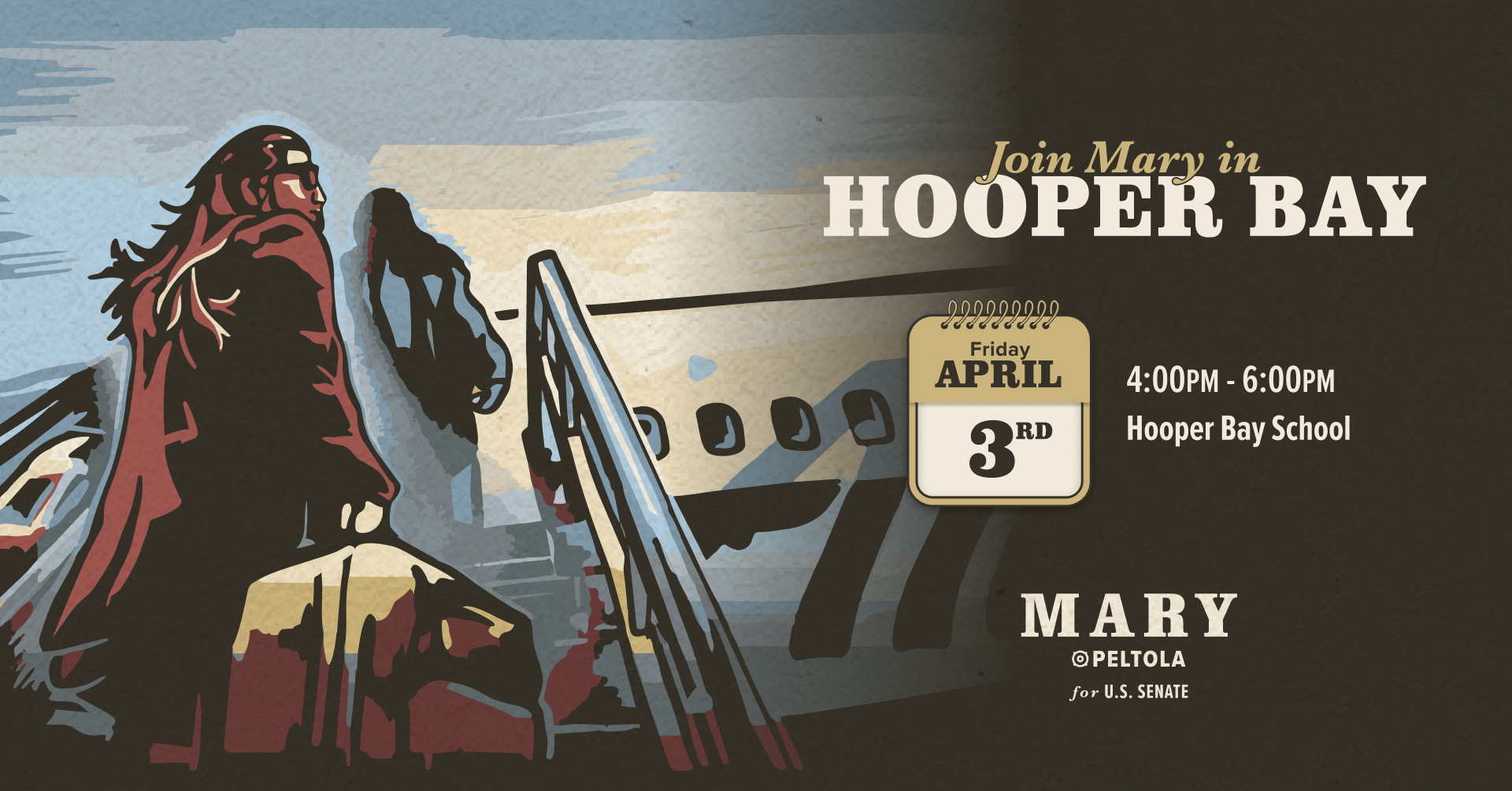 Mary Peltola is heading out on the road and will be in Hooper Bay on Friday, April 3rd. Spending time in communities like Hooper Bay is one of the most important parts of this campaign. It’s where she can hear directly from people about what’s working, what’s not, and what needs to change. Whether you’ve been involved before or just want to stop by and say hello, Mary would really appreciate the chance to connect. Hope to see you there!